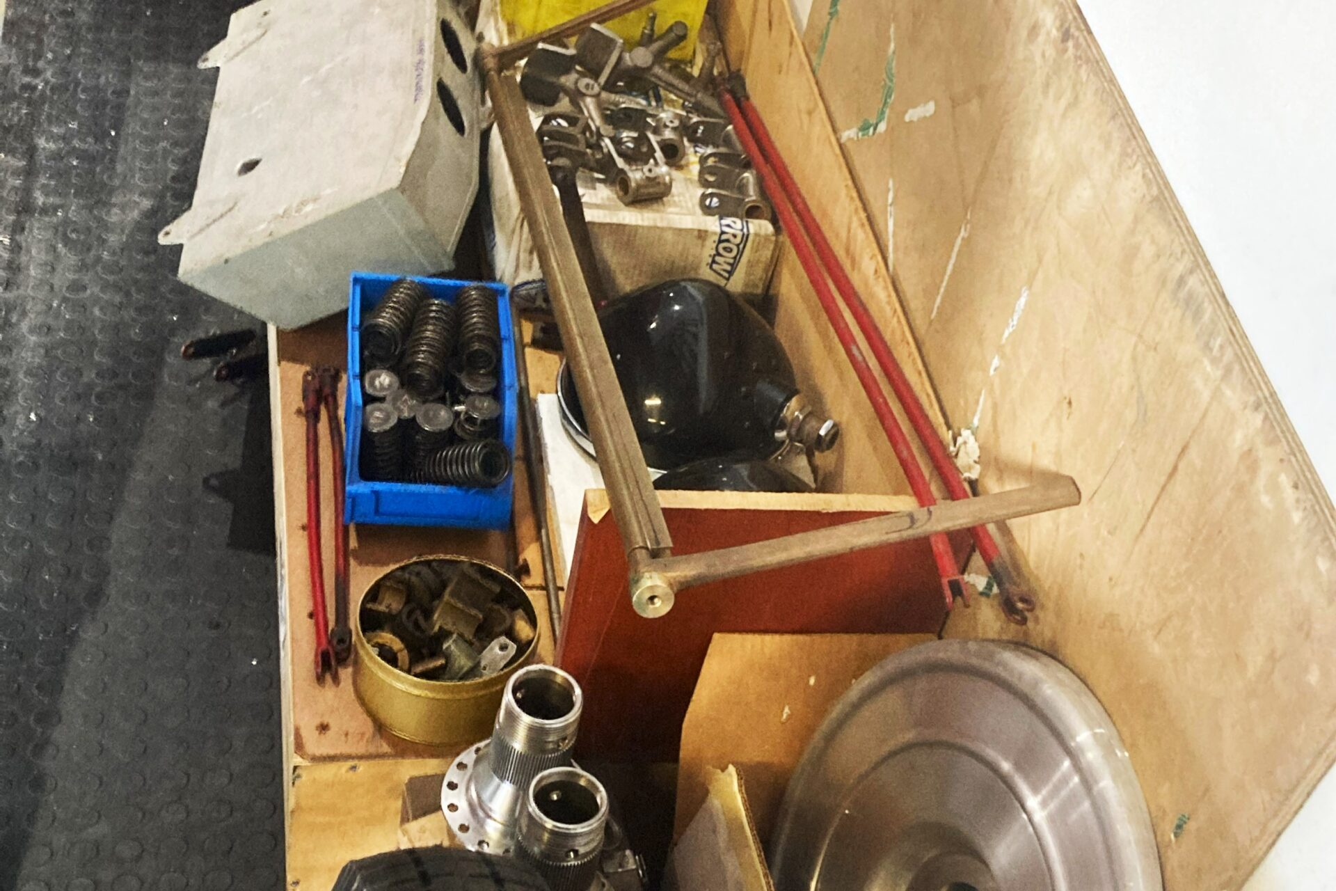 Other parts include a new radiator shell with top hose fitting, Bosch fuse boxes, headlights, radiator to headlight mounting brackets, headlight clamping brackets, dashboard with all instruments, fully machined steering box with casing, side plates, column and internals, original fuel tank, spare wheel carrier and ignition spark plug rail.