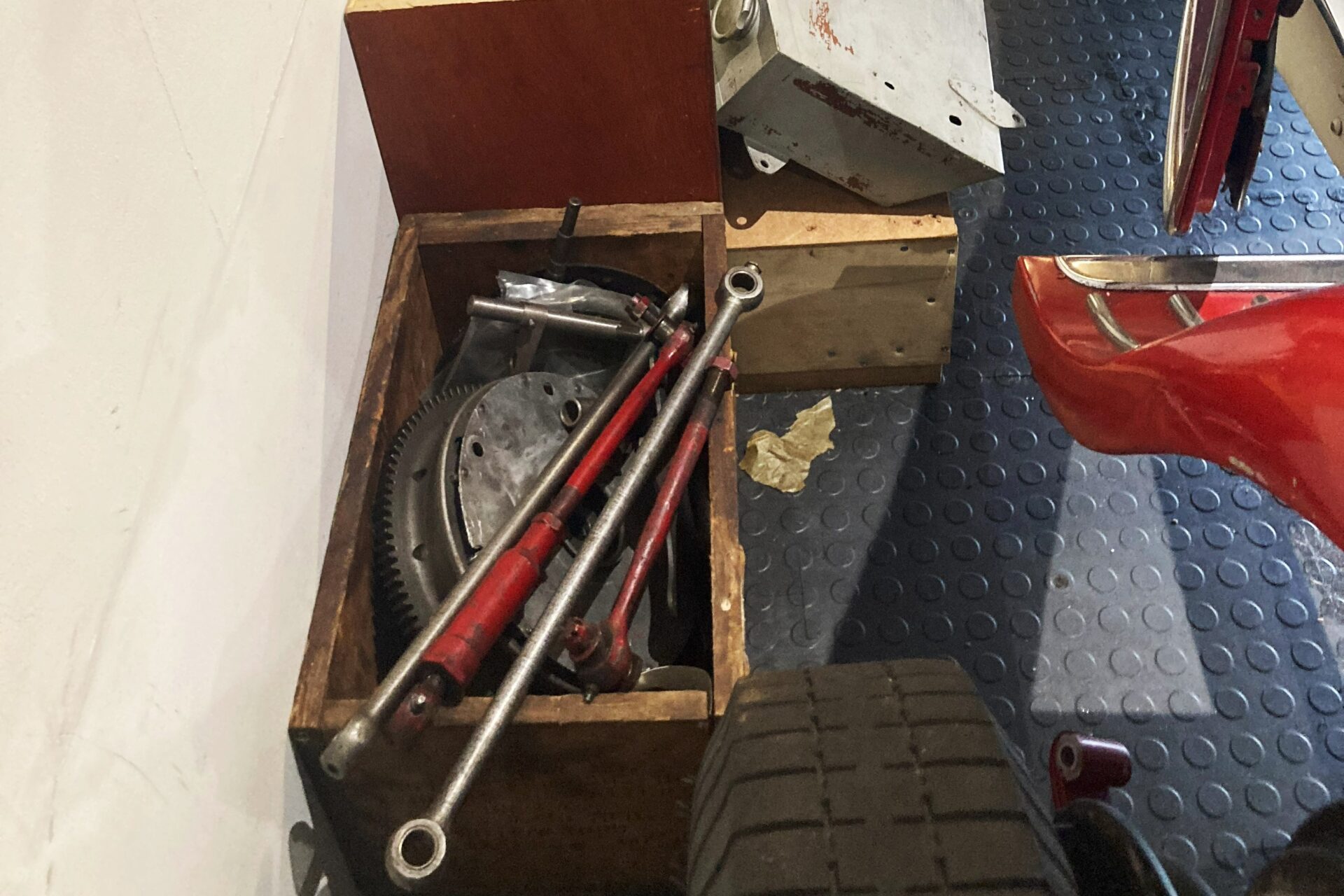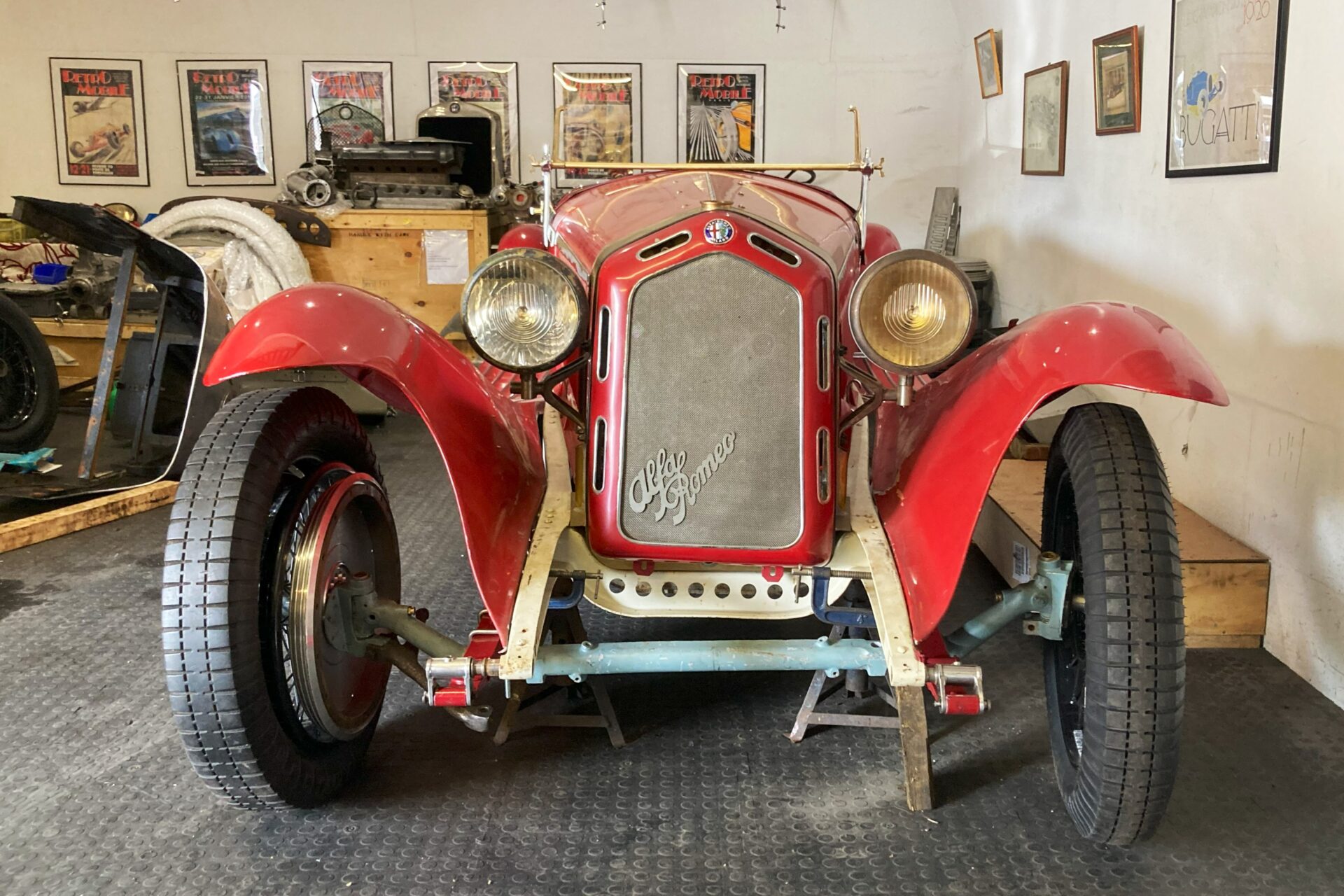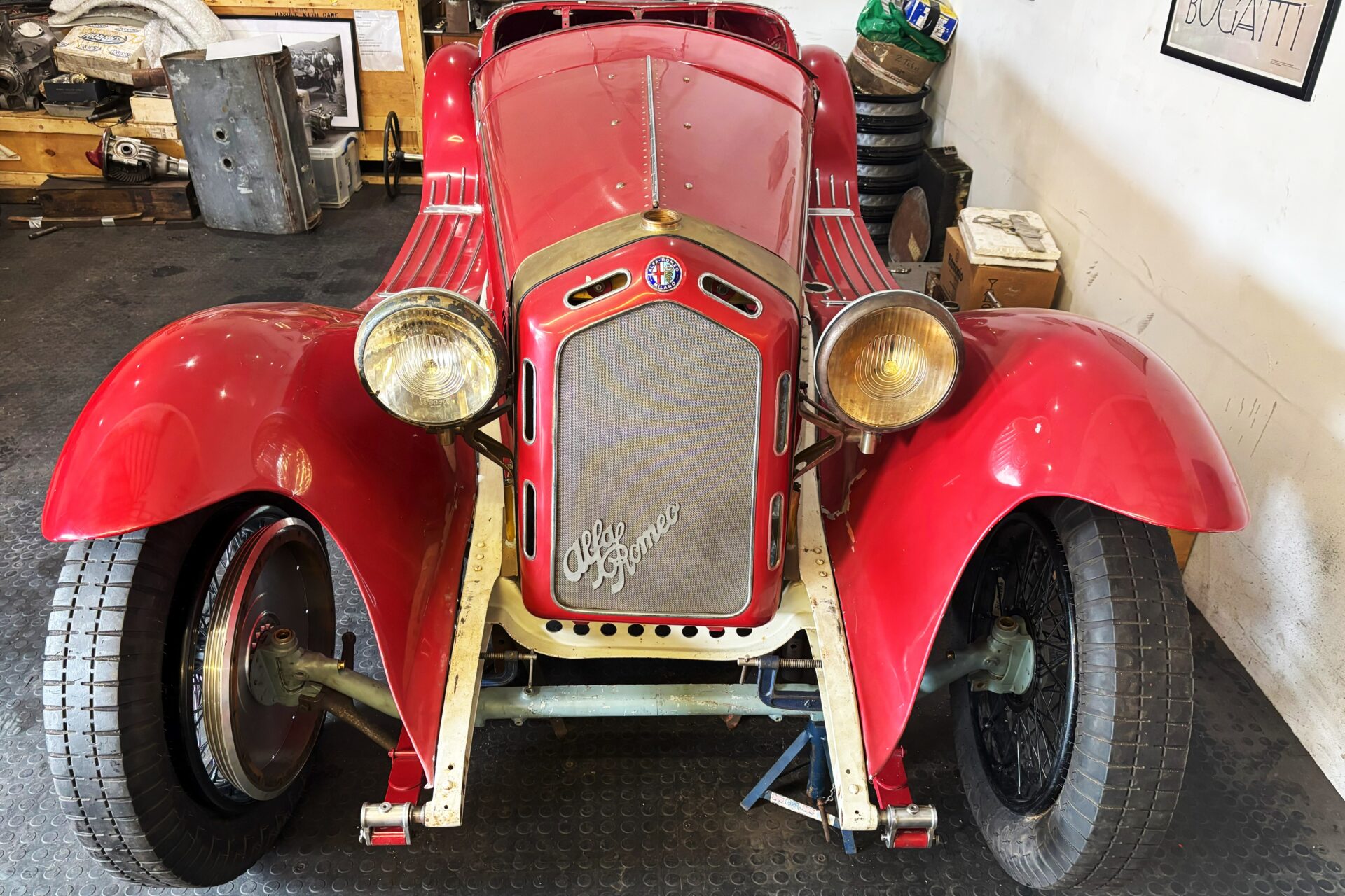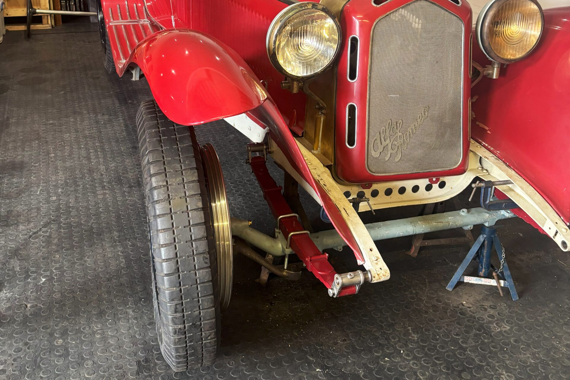 Largely complete original 6C 2300 rear axle with new fully assembled 8C differential and housing (would probably benefit from new half-shafts). Includes new bearing carriers, brake backing plates, hubs, torque tube, brake shoes, brake carriers, brake drums, road springs, shock absorbers with top and bottom brackets and five used wheels.