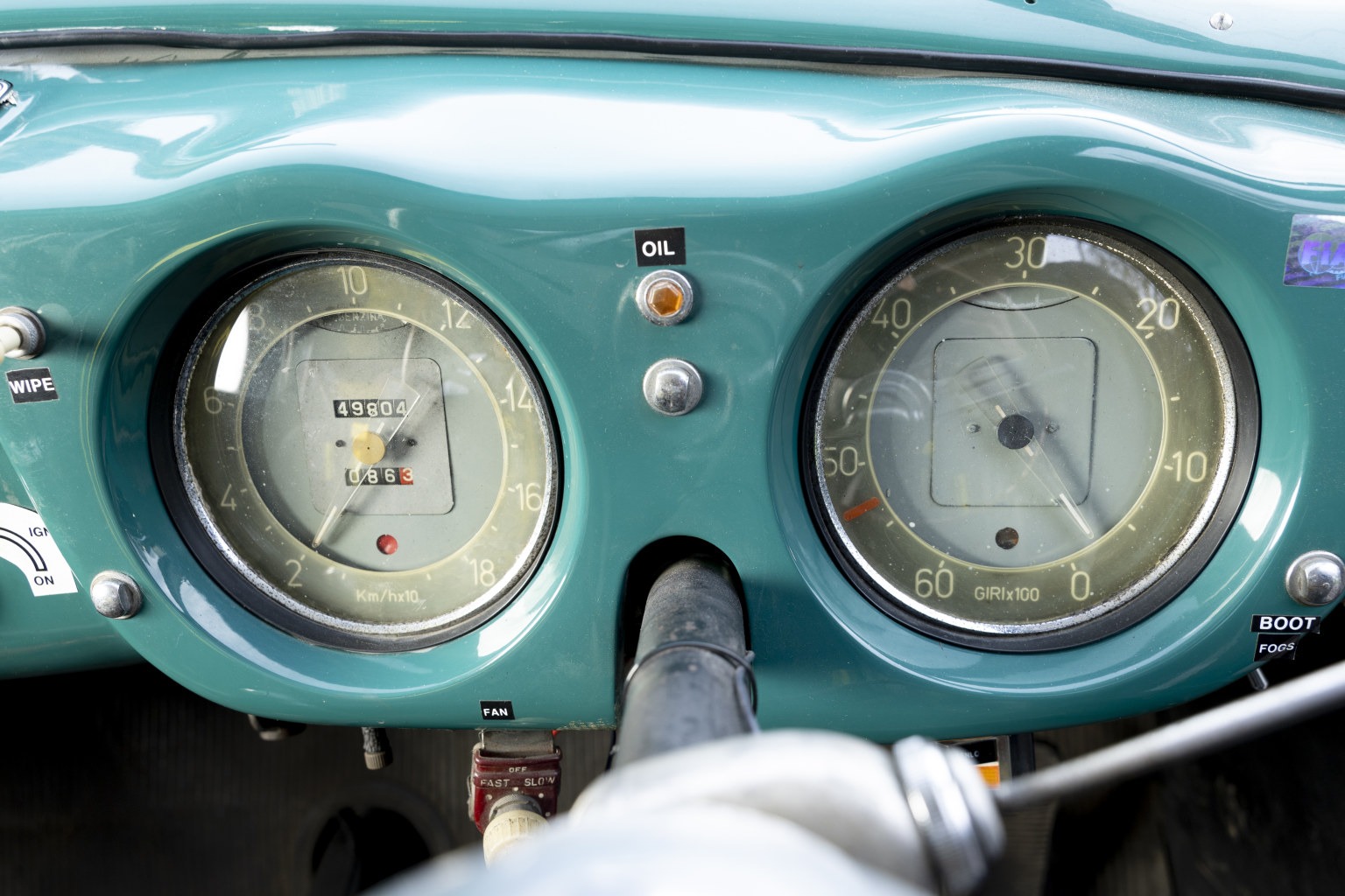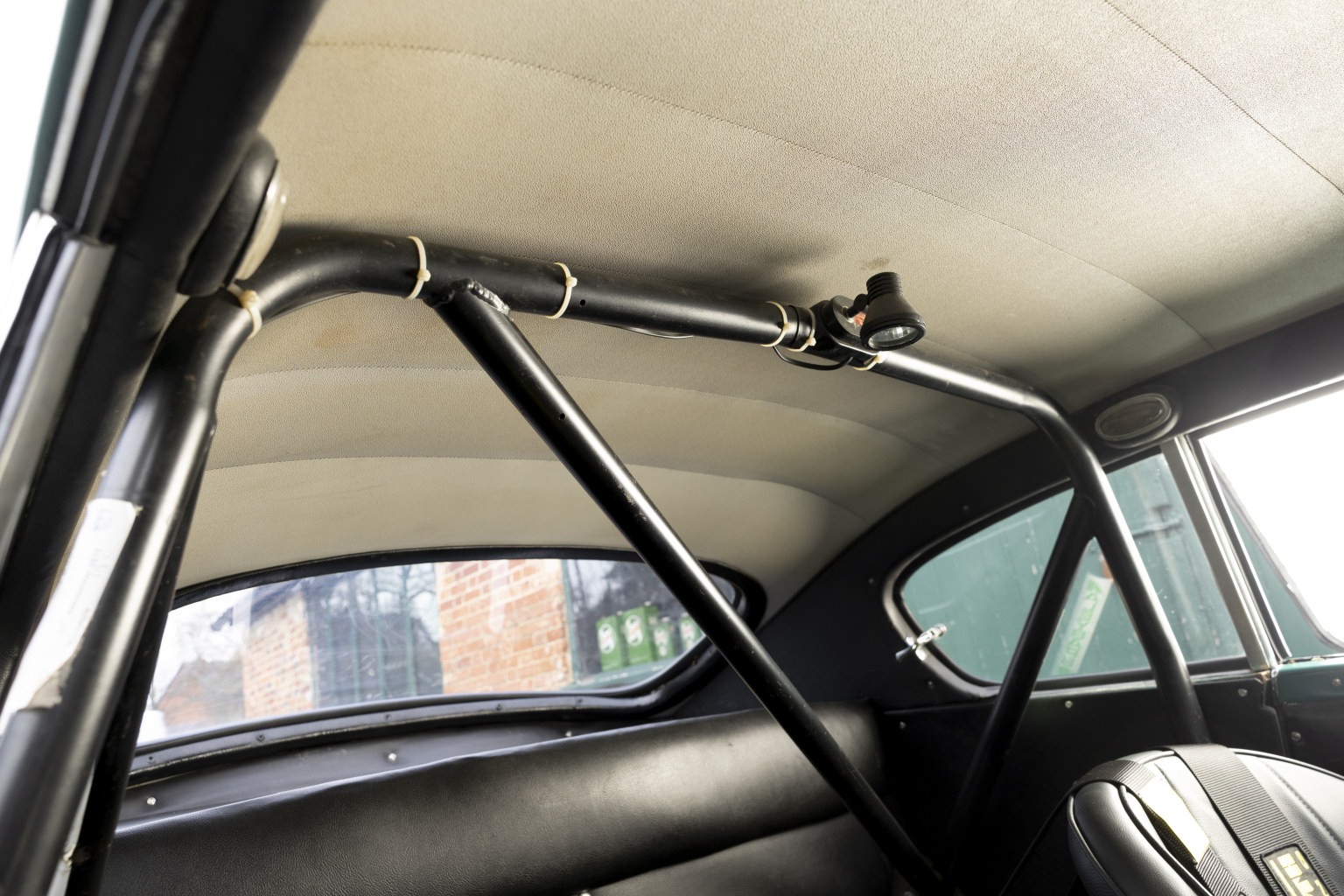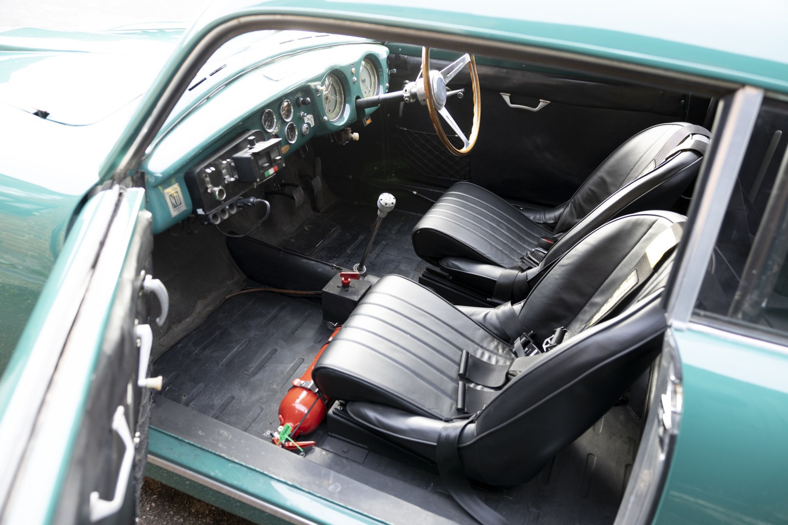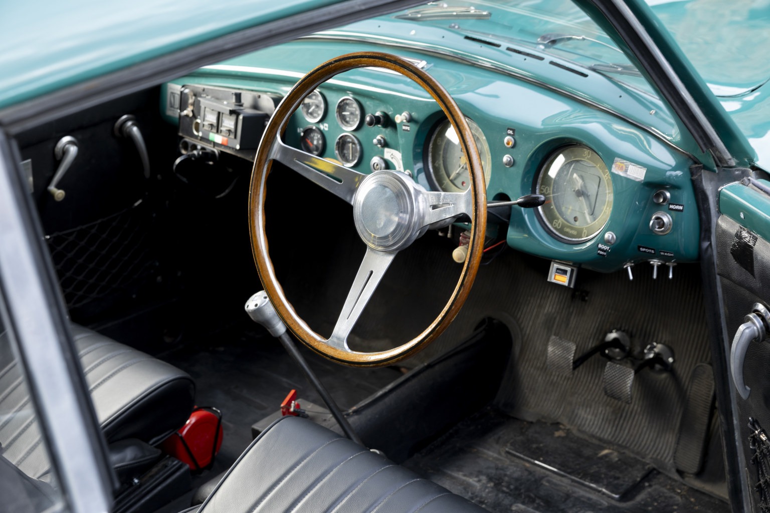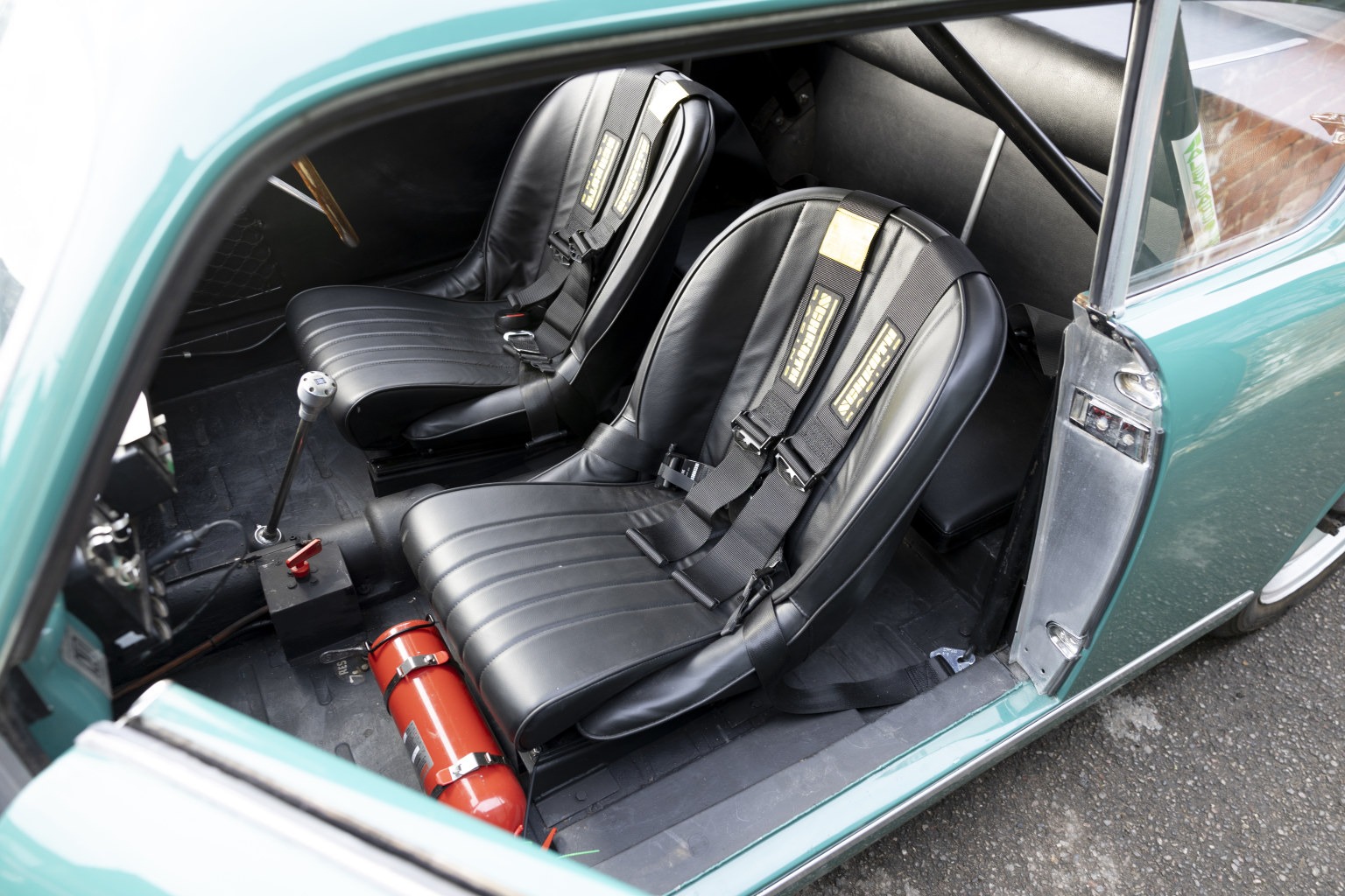 Other performance items include adjustable telescopic dampers, aluminium-cored radiator, Kenlowe fan, lightened flywheel, external oil cooler, spin-on oil filter adaptor, electric fuel pump, aluminium foam-filled fuel tank and lower and stiffer road springs. Also fitted are race legal period-style black leather bucket seats, Alfa Romeo 1900 alloy front brake drums with improved cooling, an external electric cut-off switch and a dashboard-mounted Brantz rally timer.
