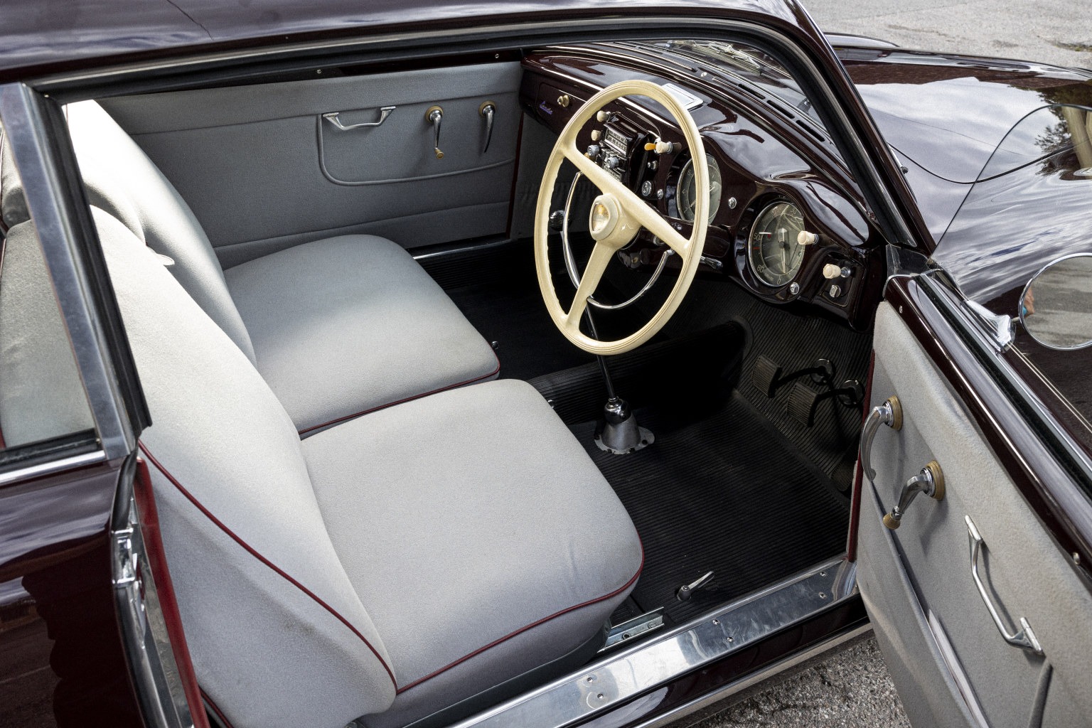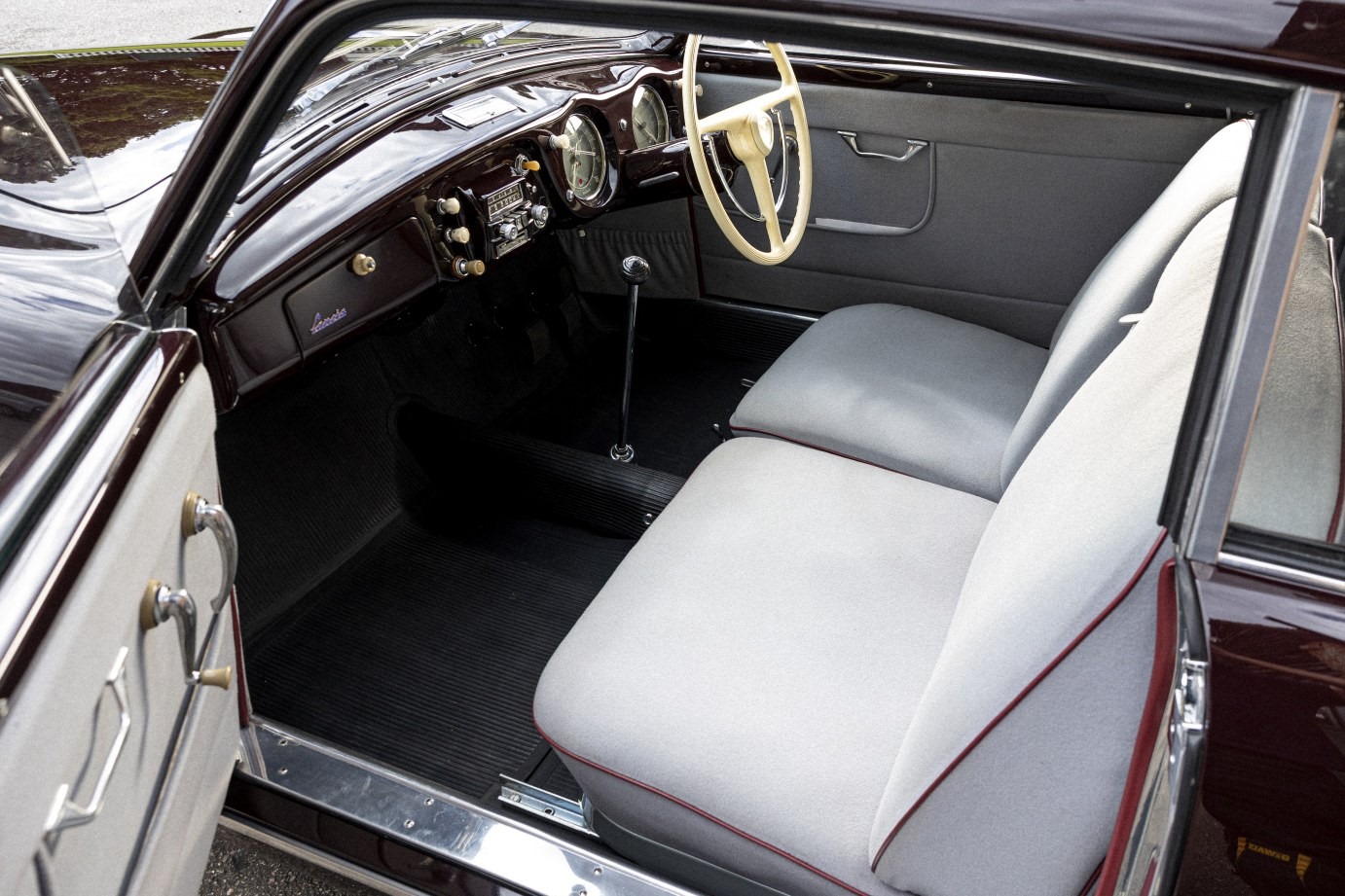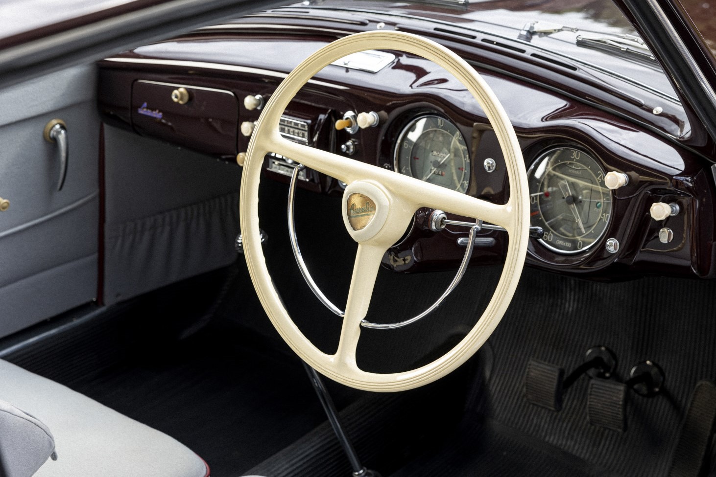 Subsequently, the Aurelia was purchased and entrusted in 2015 to leading UK Lancia restorers Thornley Kelham for a full restoration to ‘as new’ condition. The car was also returned to its original specification of ‘Amaranto’ (dark maroon) with grey ‘Panno’ Lancia wool cloth interior. The only exception to originality being the desirable conversion to floor-mounted gearchange using period-correct parts.