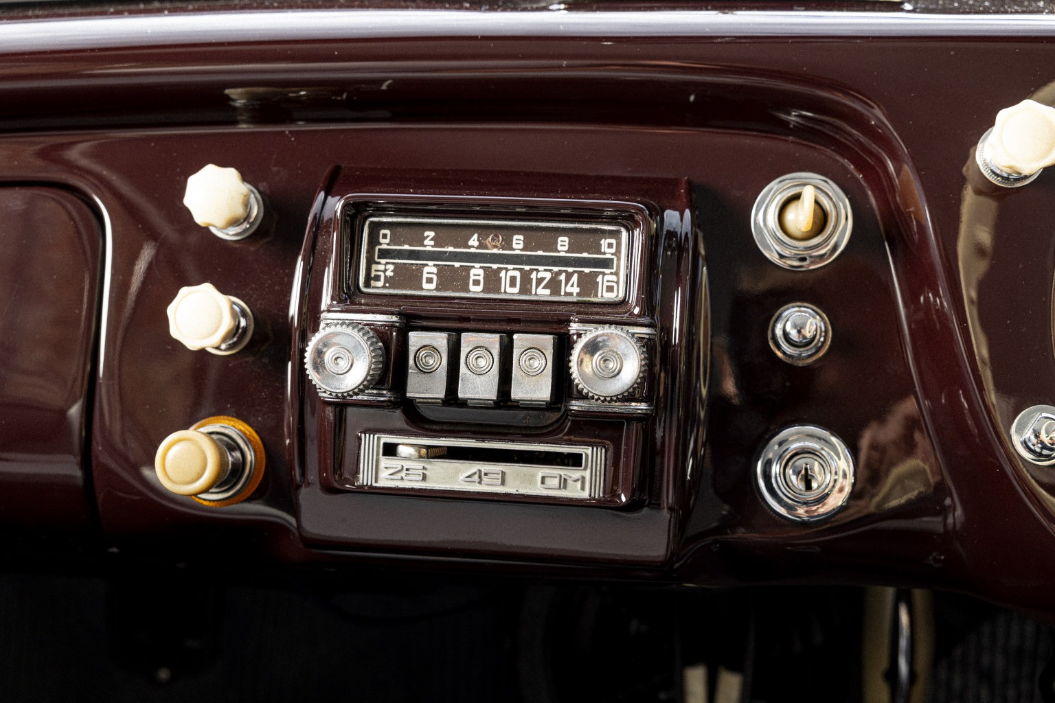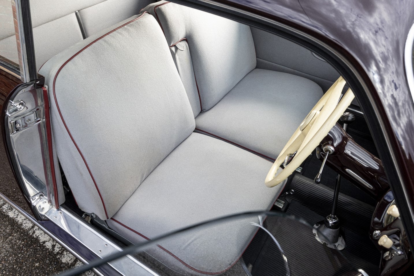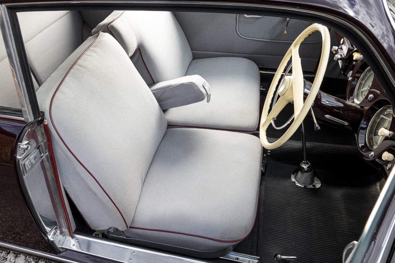 Subsequently, the Aurelia was purchased and entrusted in 2015 to leading UK Lancia restorers Thornley Kelham for a full restoration to ‘as new’ condition. The car was also returned to its original specification of ‘Amaranto’ (dark maroon) with grey ‘Panno’ Lancia wool cloth interior. The only exception to originality being the desirable conversion to floor-mounted gearchange using period-correct parts.