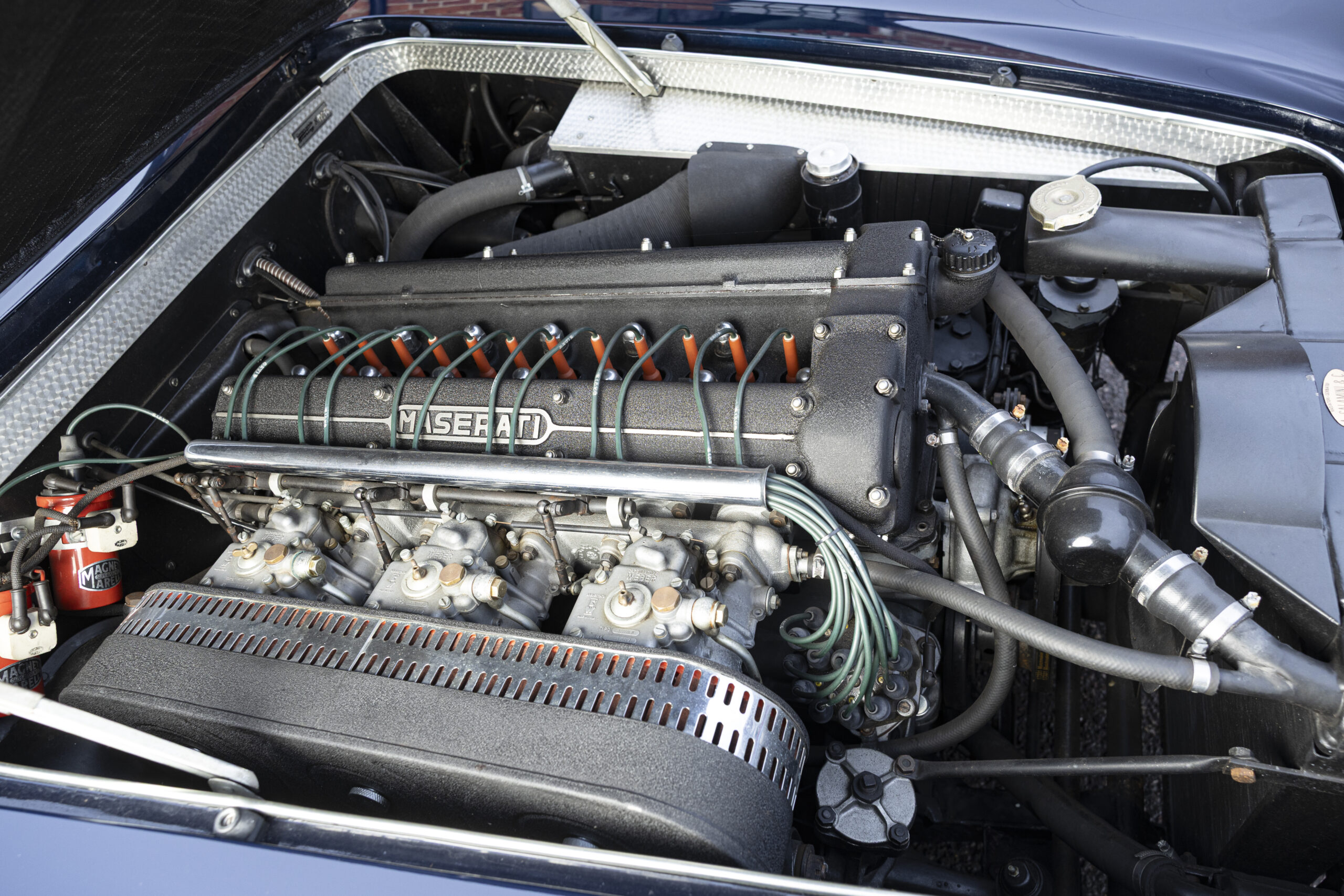 The new Maserati had a 3,500 cc six-cylinder engine derived from the 350S sports racing prototype and featured a light-alloy block and cylinder head with twin-spark plugs per cylinder. Triple chains drove the twin camshafts and a wet-sump oil system replaced the dry sump of the 350S.