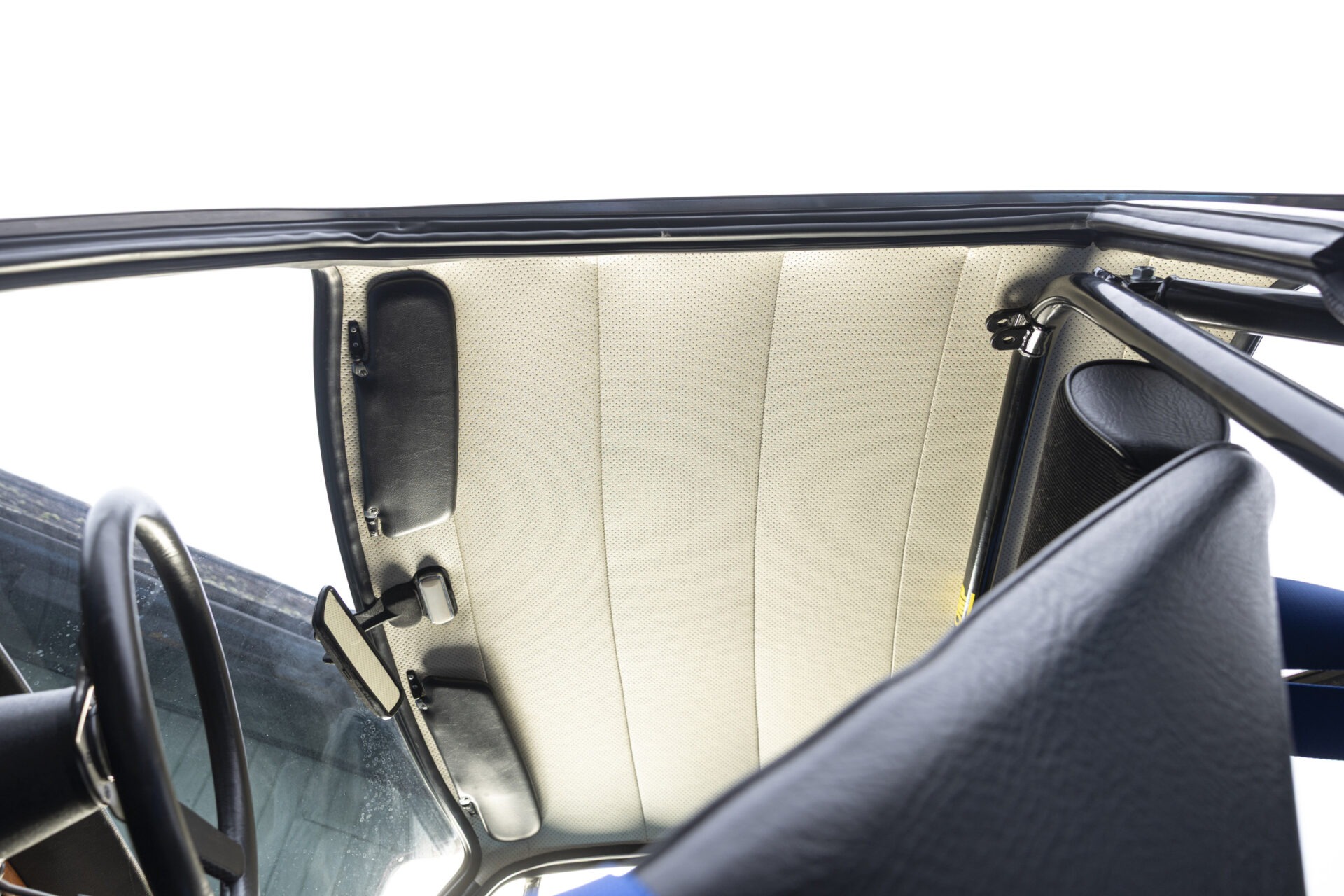Omicron stripped the body to bare metal and dealt with any corrosion. The sills, front and rear floors, boot floor and spring mount box sections were all replaced. New wheel arch panels were fitted with lead loading where required. The body was placed on its side and the wheel arches seam sealed, etch primed and the underside coated with an anti-stonechip coating. The interior metal work was finished in satin black paint.
